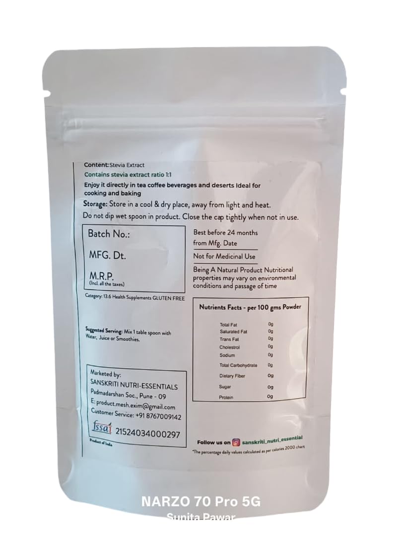Ingredients – Purest and Highest Quality of Stevia Leaf Extract :Reb – A and Erythritol. It does not contain any artificial sweeteners and chemicals like Aspartame, Sucralose and Lactose. Gluten Free , Sugar Free, Zero Glycemic Index makes Stevi0cal an ideal sweetener for Diabetics. We complement your efforts in being healthy by providing the Best Tasting , Zero Calorie Stevia at your favorite marketplaces.